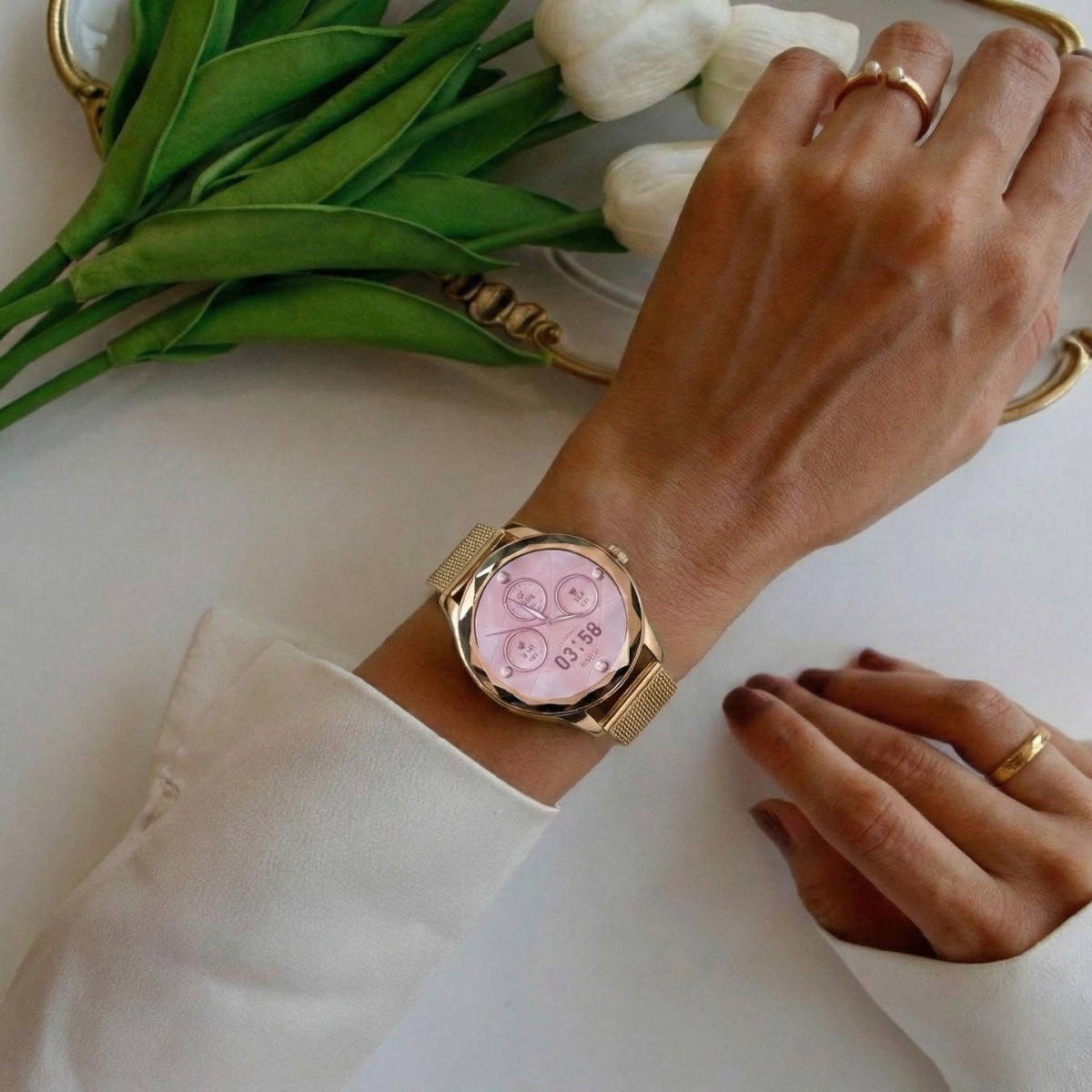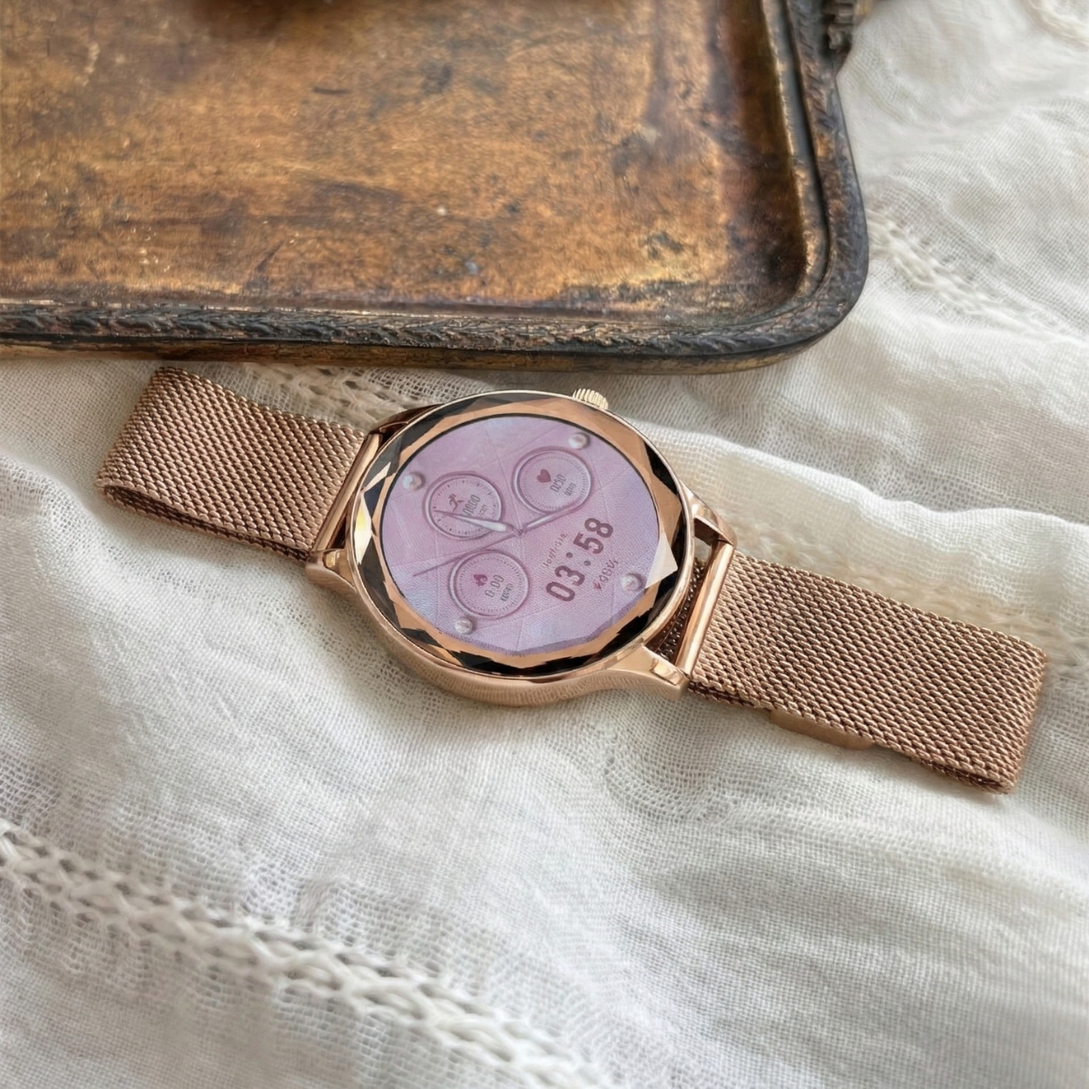 Bisel Diamante y Dial Crystal: Su bisel facetado (estilo diamante) capta la luz y eleva cualquier look. Combinado con sus más de 500 fondos de pantalla personalizables, su diseño es simplemente único.